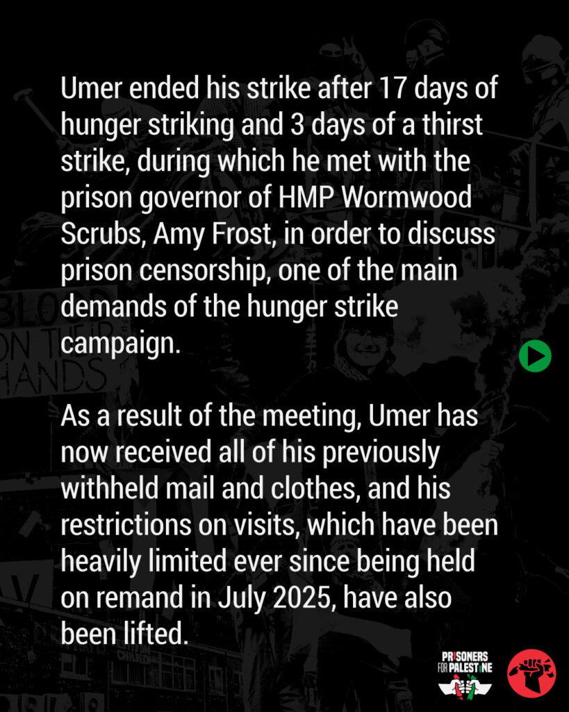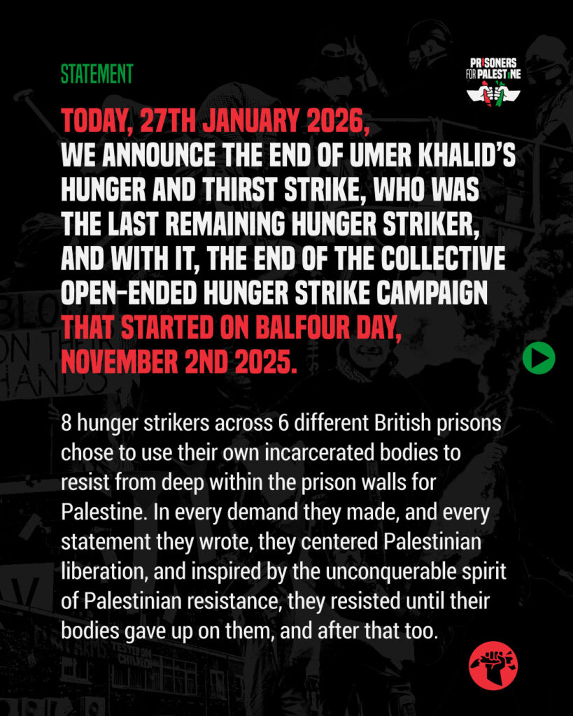 Today, 27th January 2026, we announce the end of Umer Khalid’s hunger and thirst strike, who was the last remaining hunger striker, and with it, the end of the collective open-ended hunger strike campaign that started on Balfour day, November 2nd 2025.