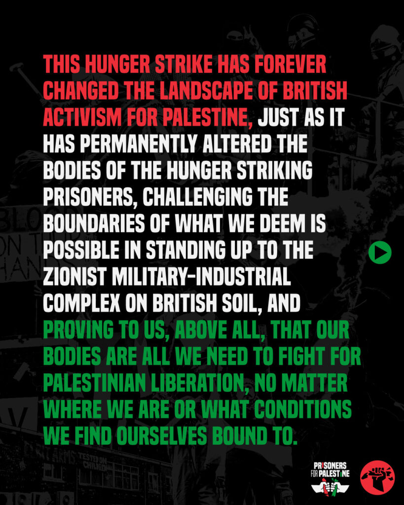 This hunger strike has forever changed the landscape of British activism for Palestine, just as it has permanently altered the bodies of the hunger striking prisoners, challenging the boundaries of what we deem is possible in standing up to the Zionist military-industrial complex on British soil, and proving to us, above all, that our bodies are all we need to fight for Palestinian liberation, no matter where we are or what conditions we find ourselves bound to.