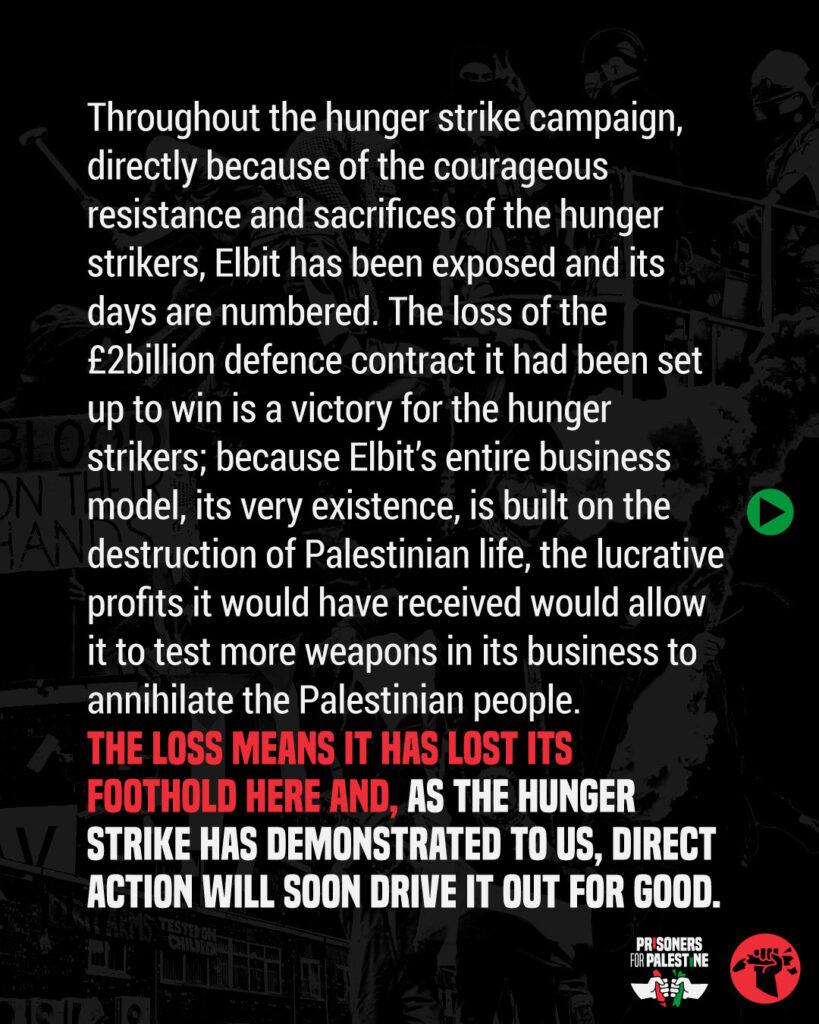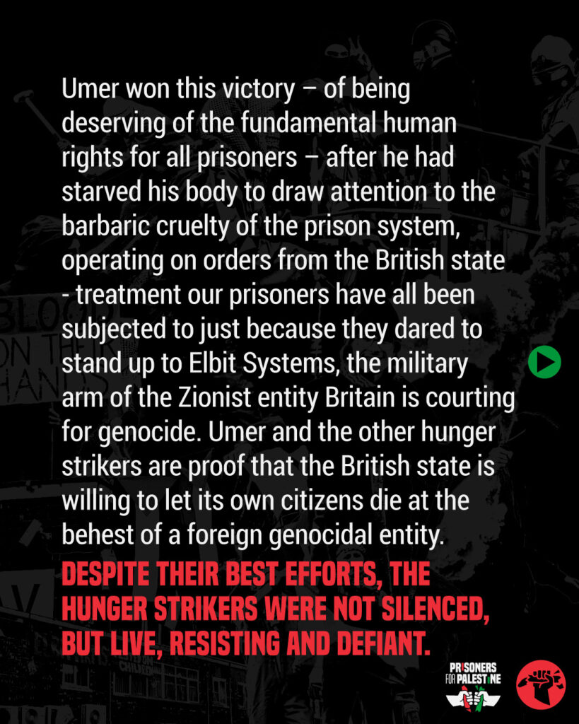 Umer ended his strike after 17 days of hunger striking and 3 days of a thirst strike, during which he met with the prison governor of HMP Wormwood Scrubs, Amy Frost, in order to discuss prison censorship, one of the main demands of the hunger strike campaign. As a result of the meeting, Umer has now received all of his previously withheld mail and clothes, and his restrictions on visits, which have been heavily limited ever since being held on remand in July 2025, have also been lifted. Umer won this victory – of being deserving of the fundamental human rights for all prisoners – after he had starved his body to draw attention to the barbaric cruelty of the prison system, operating on orders from the British state – treatment our prisoners have all been subjected to just because they dared to stand up to Elbit Systems, the military arm of the Zionist entity Britain is courting for genocide. Umer and the other hunger strikers are proof that the British state is willing to let its own citizens die at the behest of a foreign genocidal entity. Despite their best efforts, the hunger strikers were not silenced, but live, resisting and defiant.Throughout the hunger strike campaign, directly because of the courageous resistance and sacrifices of the hunger strikers, Elbit has been exposed and its days are numbered. The loss of the £2billion defence contract it had been set up to win is a victory for the hunger strikers; because Elbit’s entire business model, its very existence, is built on the destruction of Palestinian life, the lucrative profits it would have received would allow it to test more weapons in its business to annihilate the Palestinian people. The loss means it has lost its foothold here, and as the hunger strike has demonstrated to us, direct action will soon drive it out for good.