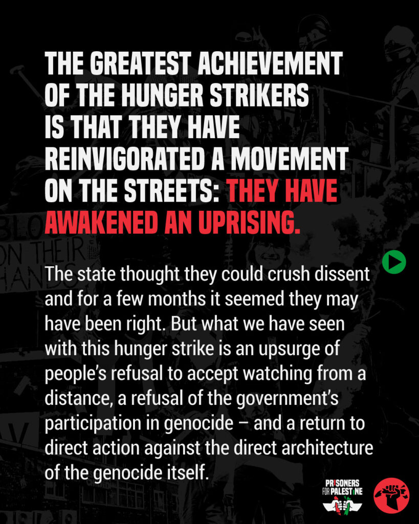 The greatest achievement of the hunger strikers is that they have reinvigorated a movement on the streets: they have awakened an uprising. The state thought they could crush dissent and for a few months it seemed they may have been right. But what we have seen with this hunger strike is an upsurge of people’s refusal to accept watching from a distance, a refusal of the government’s participation in genocide – and a return to direct action against the direct architecture of the genocide itself.
