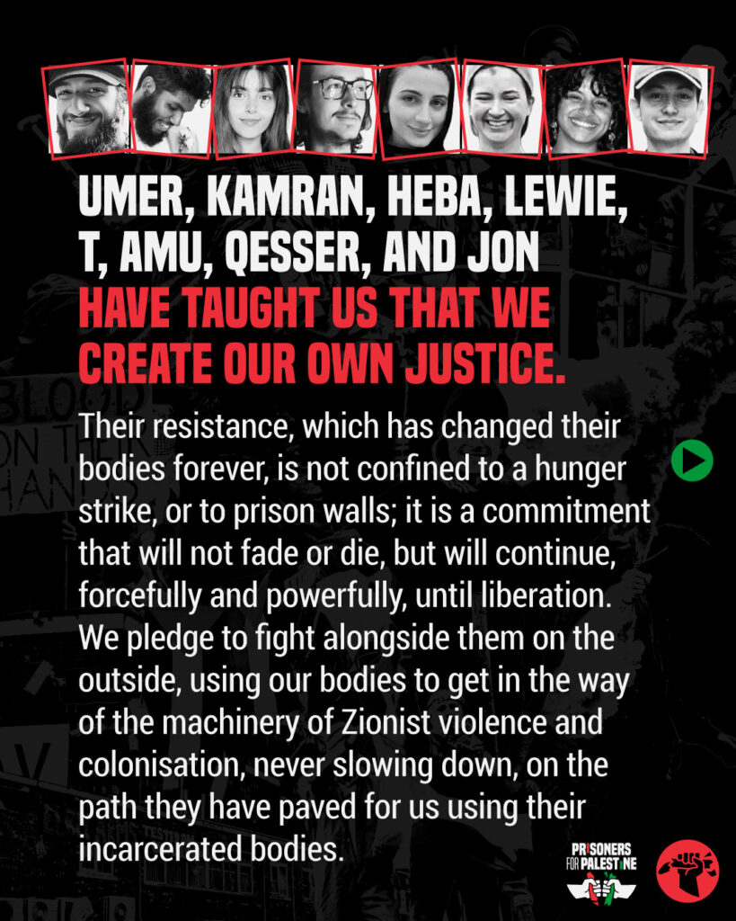 Umer, Kamran, Heba, Lewie, T, Amu, Qesser, and Jon have taught us that we create our own justice. Their resistance, which has changed their bodies forever, is not confined to a hunger strike, or to prison walls; it is a commitment that will not fade or die, but will continue, forcefully and powerfully, until liberation. We pledge to fight alongside them on the outside, using our bodies to get in the way of the machinery of Zionist violence and colonisation, never slowing down, on the path they have paved for us using their incarcerated bodies.